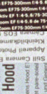 The crops above show on the left a sample of white card from the centre of the image (the Canon EF 28-70mm box) together with on the right a sample from the corner (the EF 70-200mm box). The tone of the cardboard is the same in real life, and accordingly any difference in representation on the negative will relate to light falloff. Based upon the crops above it is apparent that the newer f/4 lens records significantly less light falloff wide open, when compared to the early f/3.5 design. At f/4 the lens performs astoundingly in this respect, with very nearly no light falloff whatsoever. This lens could certainly be used with absolute confidence wide open. |