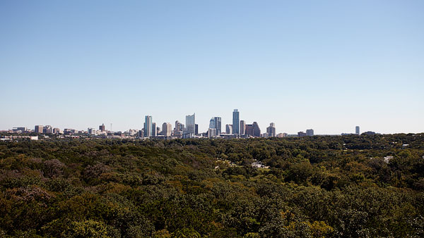 Austin, Texas skyline from 2.2 miles, seen with a 40mm lens, approximating the natural viewpoint of the human eye. |