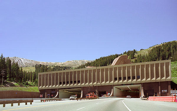 After joining the I-70 we headed west through the beautiful Alpine countryside, zipping along at a much faster pace. The I-70 is a magnificent road, passing through some of the world's most beautiful alpine country, and opening up incredible wilderness areas and ski resorts to easy access. The road also features the highest vehicular tunnel in the world, the Eisenhower Tunnel, situated about 60 miles out from Denver. This tunnel (or tunnels in fact, because the eastbound and westbound tunnels are seperate) is at an average of 11,112 feet above sea level, or over 2.1 miles high! The tunnels are approximately 1.7 miles in length, and span the peak of the great divide, that rises a further 1470 feet higher than the tunnel. While not such a great distance higher, this area of the country gets an average of over 26 feet of snow each year between November and April, so the tunnel helps ensure that the traffic can always flow. |
