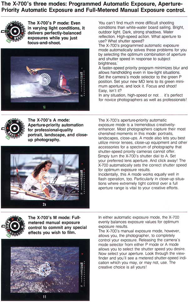 Given its phenomenal worldwide success and recent discontinuation, it is probably an excellent choice for a new Minolta user as parts will be available for many years to come, and there is probably not a single commercial camera technician in the world who has not worked on one before at some stage, so service should always be readily attainable. So why was the X-700 so popular to beginners and advanced amateurs alike? Well the main reason was undoubtedly it’s “program” mode. In addition to metered manual and aperture priority exposure modes the X-700 sported a new program mode, enabling completely automatic control of both aperture and shutter speed. For the first time, here was a sophisticated SLR camera which could be used by a person who knew absolutely nothing about photography whatsoever. Program mode made it the ultimate “point n’ shoot” camera. |