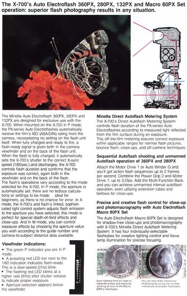 The X-700 was marketed as a professional tool, and indeed it incorporated features one would expect from a professional camera of the era, including TTL flash, exposure lock, and interchangeable screens. However it did lack the high sync speed that professional cameras normally have to meet the common professional requirement for daytime fill flash. This was probably due to Minolta's decision to implement a cloth shutter as opposed to a metal shutter such as was used in the XK, XE and XD Series bodies. The decision can most likely be attributed to a desire to minimise production costs so as to improve the affordability of the camera. By the time the X-700 was released I believe Minolta had abandoned hope of capturing a large part of the professional market, and instead had focused upon meeting the needs of the amateur, from the new beginner to dedicated enthusiast. Just as the program mode held real appeal to beginning photographers, the enthusiast market saw the introduction of the new range of accessories for the X-700 as a real selling point. The introduction of the direct autoflash metering system also made macro photography easier than ever before. |