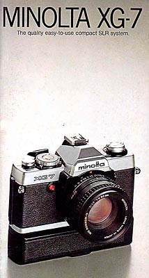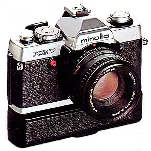 | The Minolta XG Series of cameras commenced in 1977 with the launch of the XG7 which coincided with the release of the new XD Series body, the XD11 (XD in Japan, XD7 in Europe and Oceania). The new cameras were designed to provide automatic exposure photography to users at a lower cost than the XD bodies, and as a result they fell between the XD Series and the mechanical SR-T Series that was still in production. The design of the new XG Series reflected the advances in electronics and miniaturisation being achieved at the time, and boasted a much smaller body than the XE and SR-T cameras that had preceded it. The XG Series proved to be a very successful range for Minolta, with its simplicity of use and compact size proving very popular in the marketplace. Additionally, like the XD Series the cameras would accept an auto winder (in this case the Minolta Auto Winder G) that provided motorised frame advance at up to two frames per second. The XG Series cameras all used a centre-weighted CdS cell exposure meter as opposed to the new silicon cell meters introduced with the XD series. Accordingly, their effective range and responsiveness was not as great as the XD, but the metering range of EV2-17 at ISO 100 with f/1.4 lens was more than adequate for most users. They are equipped with a horizontal-traverse cloth focal plane shutter providing speeds of 1 second to 1/1000th second, with X-sync at 1/60 and a "Bulb" setting for long exposures. The XG series cameras are basically designed to be used in aperture priority auto-exposure mode for ease of use. Accordingly, the exposure system is aperture priority auto-exposure with step-less shutter speeds, ±2 EV, with manual shutter speed settings available on most models. An over-range lock engages if a shutter speed higher than 1/1000th second is necessary, to prevent over-exposure. While manual shutter speed settings are available on most XG Series cameras, the metering display is normally inactive if manual mode is engaged, making use of manual shutter speeds a more difficult process than that available with the XD Series. There are some exceptions to this rule, however most XG cameras are not really designed for manual use. Other features of the XG Series include: